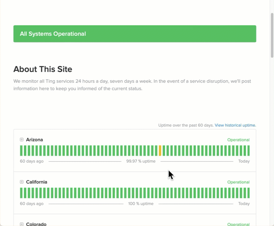 We'll update the Ting Status page whenever there is an outage or to provide alerts for Scheduled maintenance.