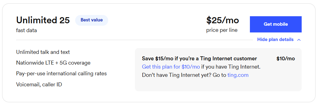 • Want more value? Bundle with Ting Internet and get both for just $99/month(Internet $89 + Mobile $10 per line).