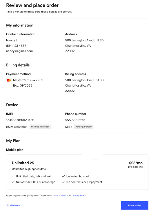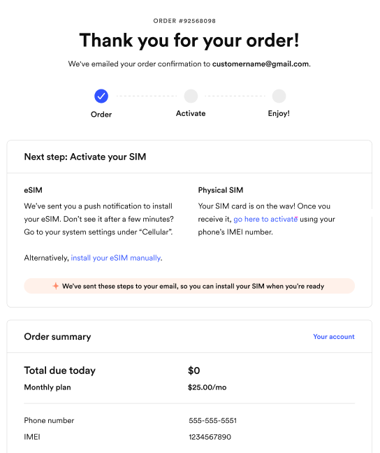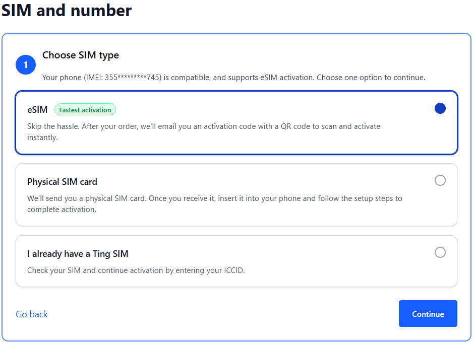• If your phone is eSIM compatible, you can select the option for eSIM. We'll send you an email with the details after activation.